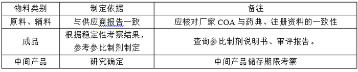 确立原料、辅料、包材、中间体、成品的质量标准。