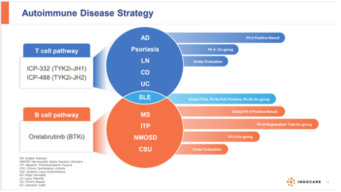 肿瘤领域之外,诺诚健华围绕BTK抑制剂进行自免领域的全面拓展,后续的TYK2抑制剂也进入二期临床阶段等。