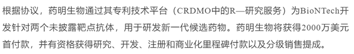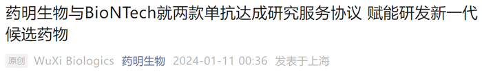 JPM会议期间,药明生物与BioNTech达成两款单抗药物研究服务协议,后者支付2000万美元预付款,以及额外的里程碑和销售分成。药明生物今日股价大涨10%。