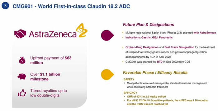 CMG901为全球首款Claudin18.2 ADC,安斯泰来单抗因生产问题收到CRL,给后来者更多缩小差距的机会。