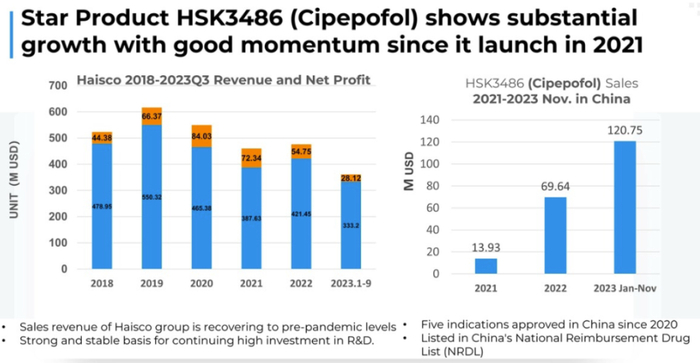 海思科的明星药物环泊酚(HSK3486)2022年销售额7000万美元,2023年前11个月销售额1.2亿美元。