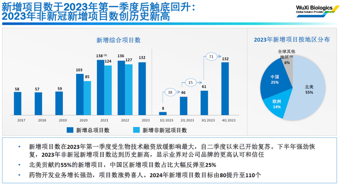 药明生物此前受一级市场融资放缓影响冲击,新增项目数放缓,不过四季度开始业务强劲恢复,中国区新增项目数大幅反弹至25%。