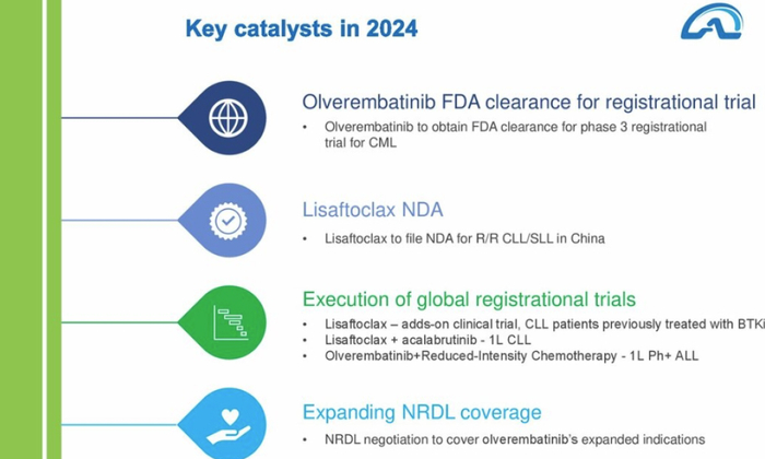 2024年将迎来多个重要里程碑,包括奥雷巴替尼获批开展美国注册临床,Lisaftoclax递交上市申请,奥雷巴替尼医保覆盖范围拓展等。