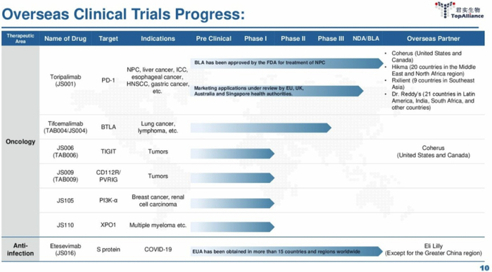 多款项目进行海外临床开发,不过TIGIT抗体刚刚被Coherus退回。