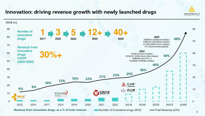 中生制药预计2023年创新药收入近百亿元,预计达到2030年达到500亿元左右。