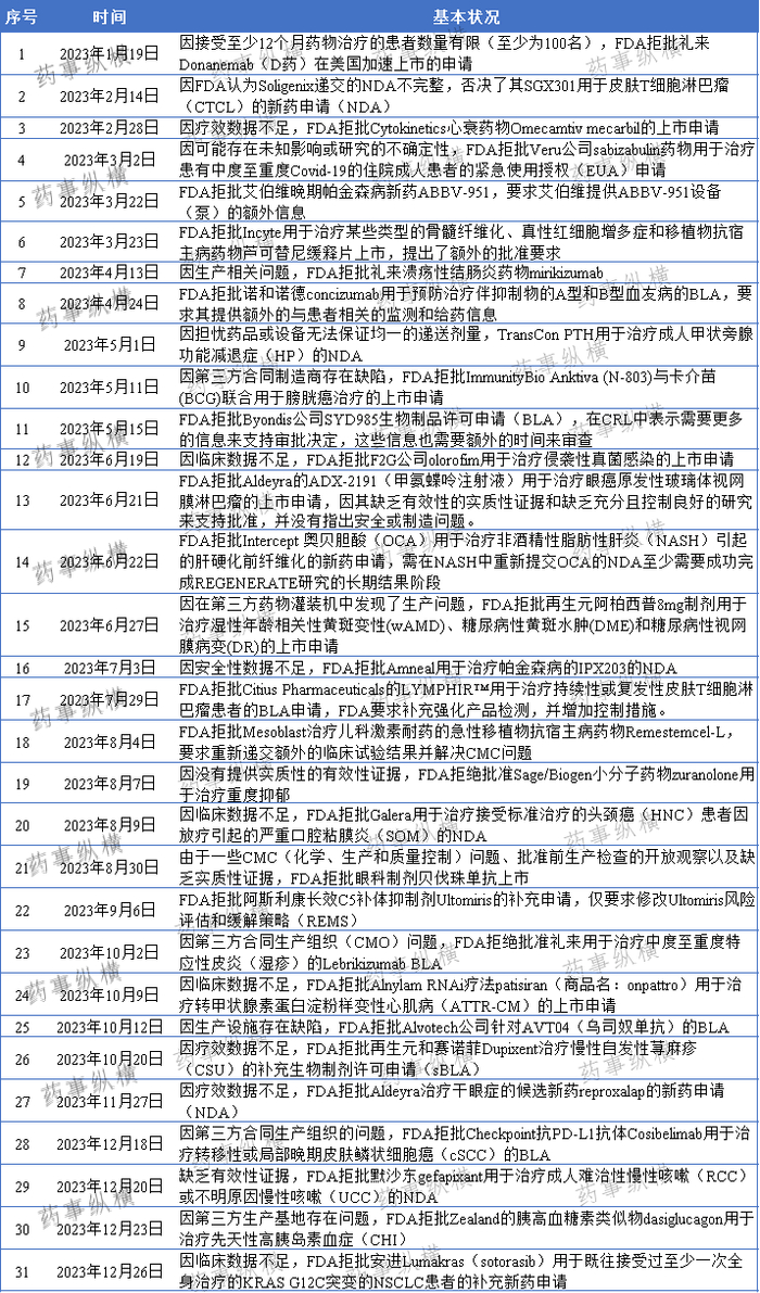 据不完全统计,过去的2023年里有31款新药被FDA拒批,涉及到肿瘤、心脏疾病、呼吸系统疾病和皮肤病等等,被拒理由绝大多数集中于对产品有效性和安全性的质疑上,包括临床获益存疑、临床数据单一等问题。除临床问题外,CMC(化学、制造和控制)问题也开始成为FDA拒绝批准的另一项重要因素。在此文中小编整理了2023年FDA拒批新药,或许能为业内理解FDA的审评标准提供帮助。