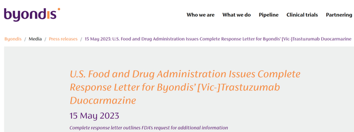5月15日,Byondis公司宣布收到FDA的完整回复函(CRL)。FDA在CRL中表示,暂停对靶向HER2的ADC药物SYD985生物制品许可申请(BLA)的批准,需要更多的信息来支持审批决定,这些信息也需要额外的时间来审查。Byondis方对FDA的决定感到遗憾,但是也表示将继续推进SYD985在欧盟和英国的上市。