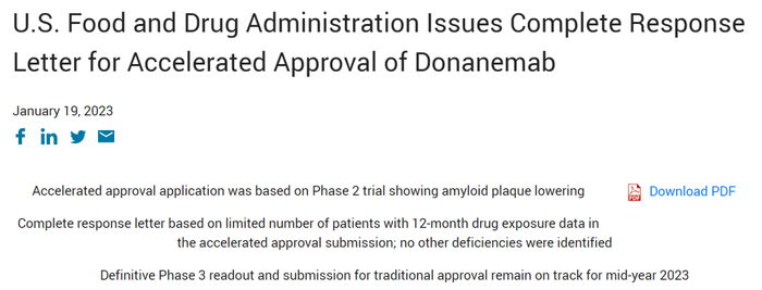 2023年1月19日,礼来发布公告表示公司已经收到FDA关于其阿尔茨海默病新药donanemab加速批准申请的完整回复函。FDA没有批准的原因是NDA申请所基于的临床试验中接受至少12个月药物治疗的患者数量有限。FDA特别要求礼来提供至少100名接受donanemab至少12个月持续治疗的患者的数据。FDA在完整回复函中未提及其它缺陷。