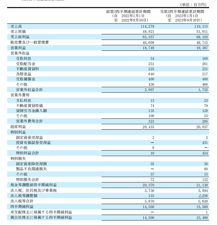 截至目前,小林制药2023年前三季度净销售额为1191.15亿日元(8.13亿美元),与上年同期相比增长4.2%,营业利润为193.87亿日元(1.32亿美元),与上年同期相比增长3.4%,普通利润为208.37亿日元(1.42亿美元),同比增长2.0%,归属于母公司所有者的净利润为154.98亿日元(1.06亿美元),同比增长6.9%。