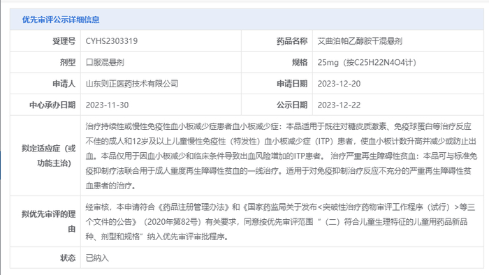 此外,据CDE官网显示,则正医药申报的艾曲泊帕乙醇胺干混悬剂也已于去年12月纳入优先审评,用于治疗既往对糖皮质激素、免疫球蛋白等治疗反应不佳的成人和12岁及以上儿童慢性免疫性(特发性)血小板减少症(ITP)以及严重再生障碍性贫血。