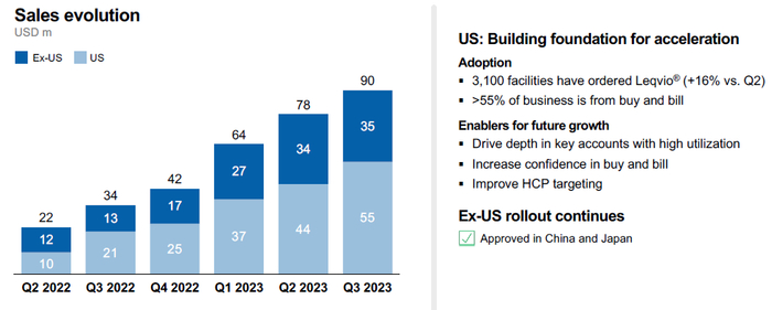 相对于PCSK9单抗,Leqvio减少了给药频率,将给药间隔延长至半年,优于现有的单抗药物,Leqvio自2021年12月被FDA批准以来销售额急剧上升,2023年前九个月Leqvio销量额已达到2.32亿美元,放量增长(图11)[8],由此可见siRNA药物治疗高血脂症也有很大的市场。
