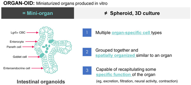 类器官不同于细胞球体,它是部分或全部的多细胞结构。类器官是体外小型化和简化的三维结构,具有构成器官的多种器官特异性细胞类型。类器官应该满足:1)它们由靶器官的细胞组成;2)具有靶器官的特定结构;3)它们可以再现靶器官的特定功能。球体模拟实体瘤用于癌症治疗,类器官则提供了研究器官对象的形态、功能和疾病相关模型。