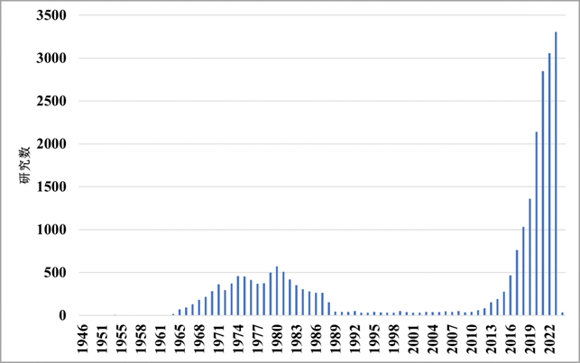 1966-1988年间首次出现爆发(研究数>50篇),归因于通过细胞解离和再聚集实验来描述器官发生的经典发育生物学实验的研究。类器官研究的复兴在2010年后,但形式有所不同:类器官被定义为干细胞生长的3D结构,由器官特异性细胞类型组成。