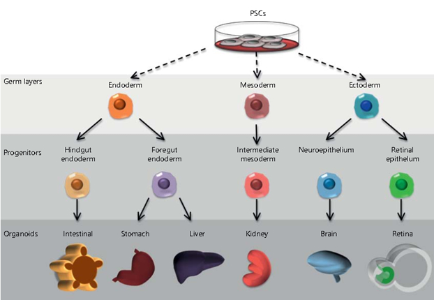 类器官来源于多能干细胞(pluripotentstem cells (PSCs))(胚胎干细胞、诱导多能干细胞(iPSC))和成体干细胞。其中,胚胎干细胞有一定的伦理问题,而肿瘤患者穿刺等活检也可以是类器官来源之一。多能干细胞在3D培养过程中可聚集形成拟胚体,并诱导分化产生外胚层、中胚层和内胚层后最终形成特定组织的类器官。