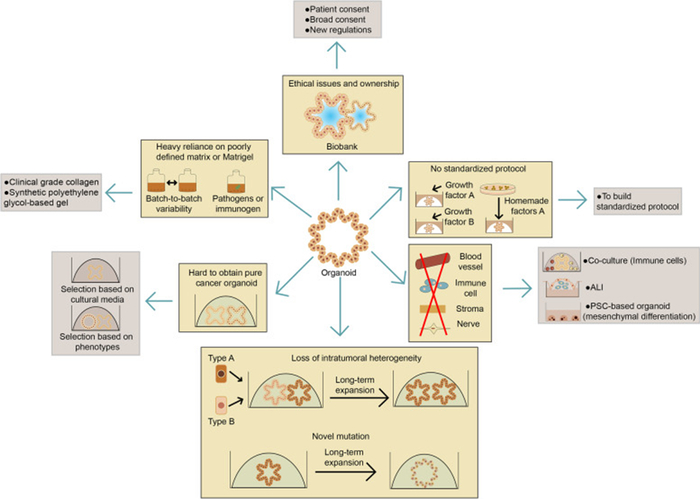第三,获得纯的肿瘤类器官是研究人员面临的另一个关键问题,肿瘤类器官可能过度生长并被正常类器官污染。而且,肿瘤类器官在传代过程中可能会失去肿瘤内异质性和长期扩增发生突变问题。
