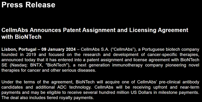 2024年1月15日,葡萄牙生物技术公司CellmAbs宣布已与BioNTech签订专利转让和许可协议,将一款临床前候选ADC新药及ADC技术授权给BioNTech。CellmAbs将获得预付款和近期付款,并可能有资格获得数亿美元的里程碑付款,以及分级特许权使用费,该项合作的价值约10亿美元。
