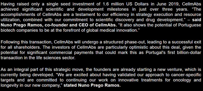 据了解,CellmAbs成立于2019年,聚焦于ADC、双抗、细胞疗法等,从里斯本新大学剥离独立。专注于开发针对癌症特异性抗原的新型单克隆抗体,重点研究ADC、双特异性T细胞吞噬剂和细胞疗法。目前,CellmAbs研发管线集中在ADC、免疫治疗和细胞治疗三大领域,但尚未披露靶点细节。