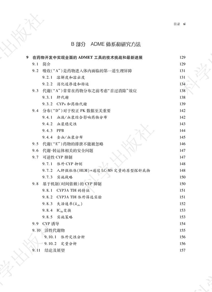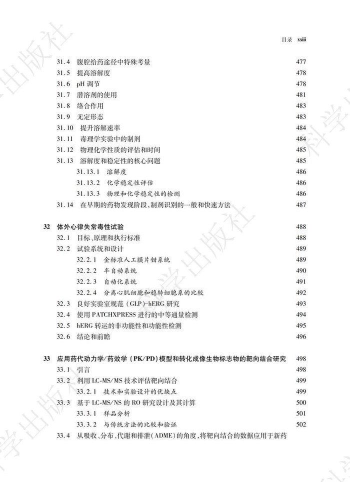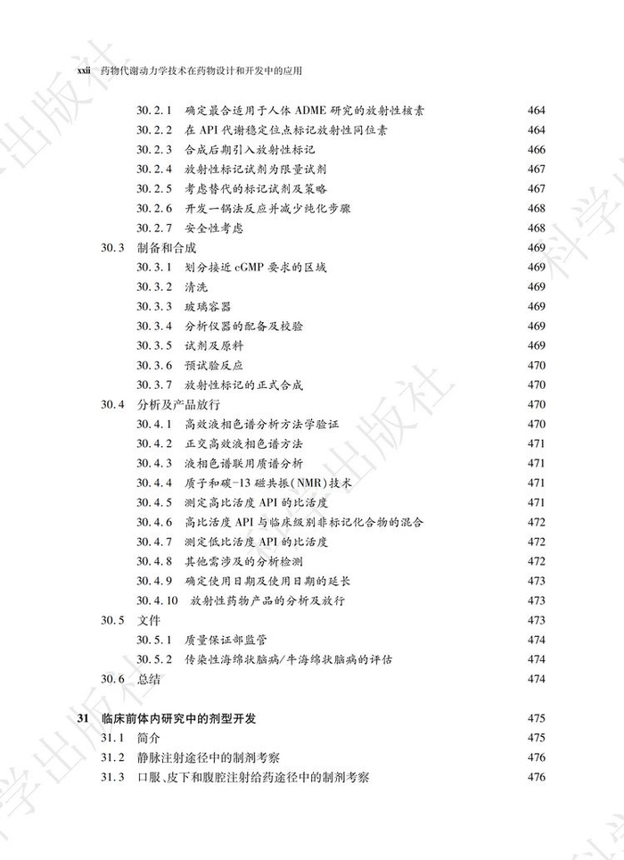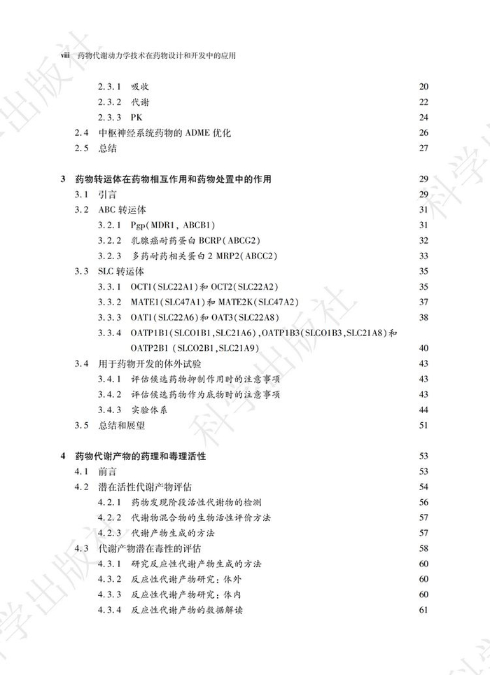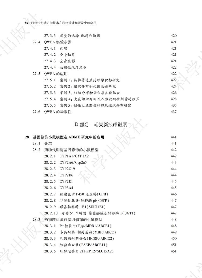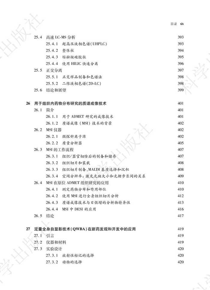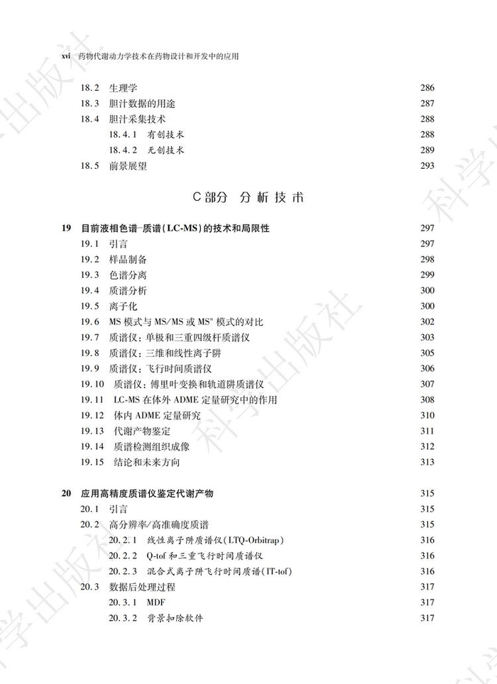 《药物代谢动力学技术在药物设计和开发中的应用》一书共分为四个部分,三十四个章节。第一部分综述了ADME的相关概念和一些前沿的话题,包括药物发现和开发过程中的ADME和转运体研究;具有活性或毒性的代谢物建模与仿真,以及生物药和个体化药物的研发。第二部分介绍了ADME的体系和研究方法;包括ADME筛选技术,渗透性和转运体实验,特殊屏障的分布实验如血脑屏障(BBB)或胎盘屏障,细胞色素P450 酶的抑制、诱导和酶表型鉴定;用于代谢和转运体研究的动物模型,以及胆汁采集。第三部分对分析技术进行了探讨,包括用于定量和代谢物鉴定的液相色谱串联质谱技术(LC-MS)、加速器质谱法(AMS)、放射性分析、核磁共振(NMR)、超临界流体色谱法(SFC)和其他的分离技术;质谱成像,定量全身放射自显影(QWBA)组织分布技术。第四部分介绍了ADME 研究中的一些不断发展的新技术,如干细胞、转基因动物模型和siRNA 等。这一部分还包括了一些其他的技术,如目标成像技术、放射性同位素标记、剂型开发以及心血管毒性风险的评估。