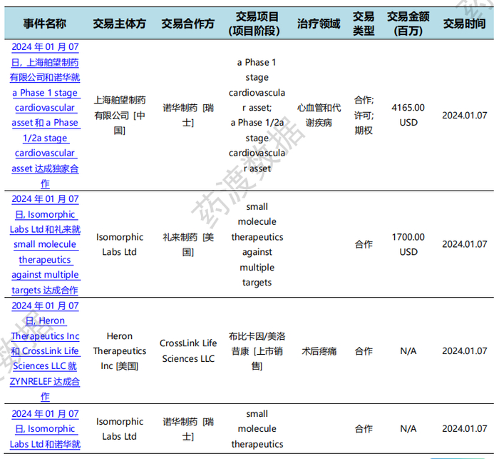 1月7日,舶望制药宣布与诺华达成合作协议,舶望将一款I期临床项目的全球权益授权给诺华,同时诺华将选择心血管疾病另外两个靶点。此外,诺华还获得一款1/2a期临床项目的大中华区外全球权益。诺华支付1.85亿美元预付款,合作总金额高达41.65亿美元。