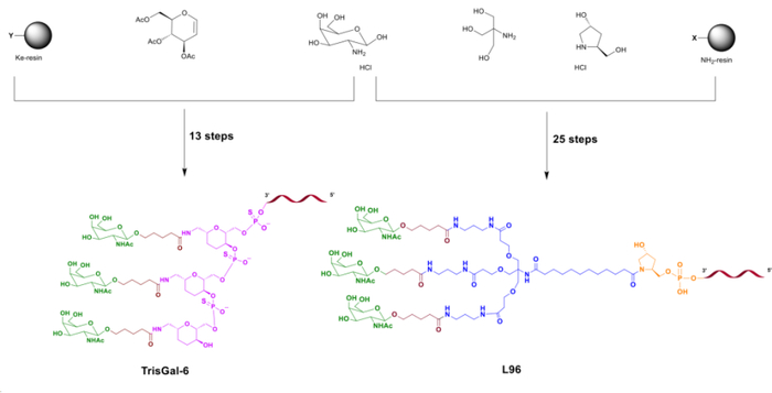 而金中锘美团队对传统的GalNAc簇的连接方式进行了改进,通过引入吡喃作为连接物,在三价共轭基序中生成了GalNAc缀合物(TrisGal-6),并利用自研的负载能力较高的氨基树脂进行siRNA GalNAc缀合物固相合成。
