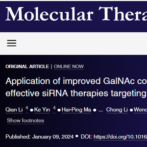 近日,Cell子刊《Molecular Therapy 》发布了一篇研究,题为“Application of improved GalNAc conjugation in development of cost-effective siRNA therapies targeting atherosclerotic cardiovascular diseases”[1]。该研究由上海金中锘美生物医药科技有限公司(简称“金中锘美”)与北京阜外医院李建军教授合作发布。