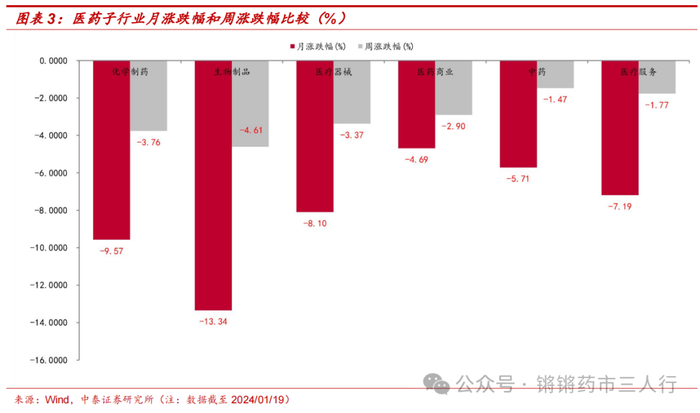 ■深度回调后更具信心,基本面无虞回暖在即。本周沪深300下跌0.44%,医药生物下跌3.09%,处于31个一级子行业第16位,本周子行业中药、医药服务、医药商业、医疗器械、化学制药、生物制品分别下跌1.47%、1.77%、2.90%、3.37%、3.76%、4.61%;细分行业均有所回调。2024年以来,A股整体市场面临深度调整,医药板块由于在2023年四季度受到资金青睐表现强势,年初以来回调明显。医药板块年初至今下跌8.67%,位于31个申万一级子行业第27位,医药指数已经低于2022年9月的3年维度的底部。年初以来跟随市场的调整,与医药板块的基本面关系较小,更多来自宏观、资金层面的整体风险,因此我们认为一旦市场消化短期担忧及情绪实现回暖,医药板块有望成为全市场表现最亮眼的行业之一。逻辑仍然基于基本面、政策面、资金面三重底部:1)基本面:医药行业需求确定,有望持续向好;近期对于老龄化的多方关注及政策有望强化医药长期基本面的确定性。2)政策面:医改整体政策已经较为完善,反腐趋于常态化稳定,政策的负面影响在基本面、情绪面都已经充分体现。3)资金面:医药板块自2021年6月以来,已经经历近3年的持续调整,当前估值、持仓均处于底部区间,性价比突出。我们看好老龄化背景下的医药创新的还需升级、高端制造的全球竞争、消费医疗的复苏升级。短期角度,看好一季报超预期、出海。