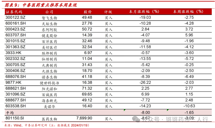 ■重点推荐个股表现:1月重点推荐:智飞生物、天坛生物、东阿阿胶、健友股份、百洋医药、美好医疗、联邦制药、仙琚制药、九典制药、九强生物、诺泰生物、健世科技-B、阳光诺和、百诚医药、海泰新光、美诺华。中泰医药重点推荐本月平均下跌8.00%,跑赢医药行业0.67%;本周平均下跌1.65%,跑赢医药行业1.44%。