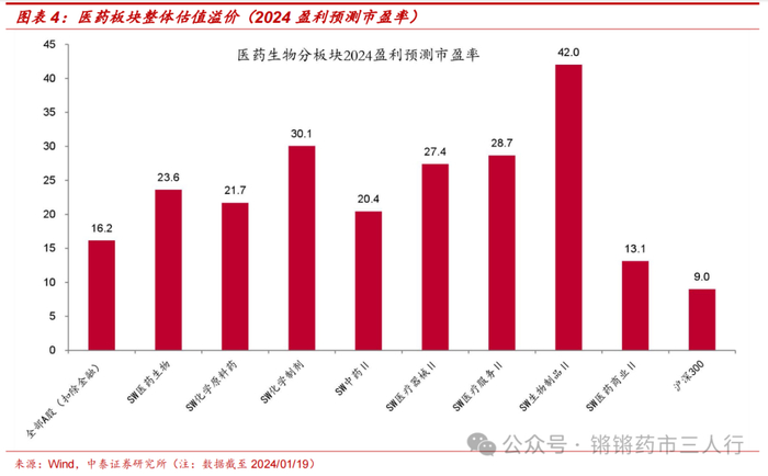 ■ 板块估值:以2024年盈利预测估值来计算,目前医药板块估值23.6倍PE,全部A股(扣除金融板块)市盈率大约为16.2倍PE,医药板块相对全部A股(扣除金融板块)的溢价率为46.1%。以TTM估值法计算,目前医药板块估值25.5倍PE,低于历史平均水平(35.9倍PE),相对全部A股(扣除金融板块)的溢价率为42.3%。