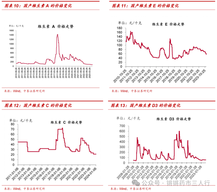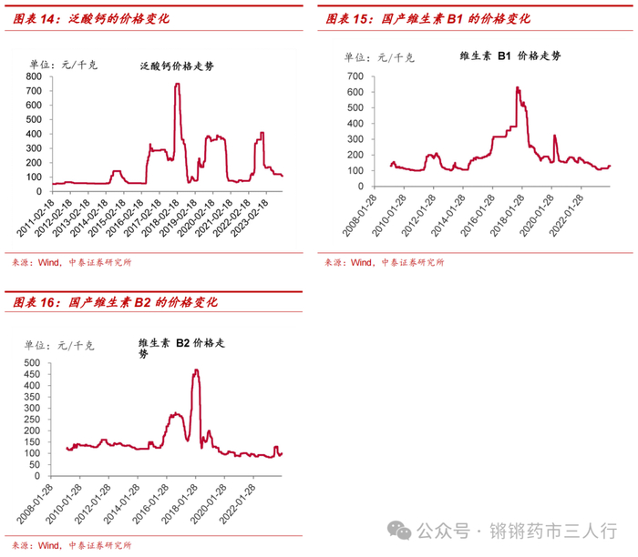 ■ 维生素价格重点跟踪:本周维生素A、泛酸钙、维生素B1价格略有提升,维生素E、D3、B2、C,泛酸钙价格基本保持稳定。