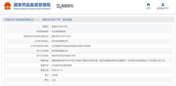据国家药品监督管理局官网显示,特丰制药水合氯醛灌肠剂根据质量标准YBH03182019制定了稳定性考察方案,其稳定性数据结果符合方案要求,江苏省药品监督管理局将水合氯醛灌肠剂有效期由24个月变更为36个月,并于2024年1月17日完成备案,将于2024年2月正式执行。
