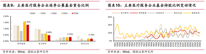 医疗服务: 2023Q4医疗服务基金重仓比例环比下降0.63pct 至3.36%,其中药明康德1.32%(-0.24pct),爱尔眼科0.48%(-0.13pct),金域医学0.33%(-0.01pct)和康龙化成0.19%(-0.01pct)。