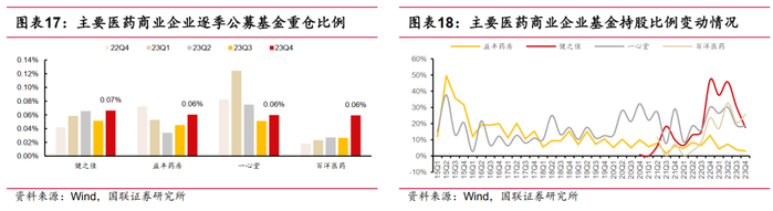 医药商业:2023Q4 医药商业基金重仓比例环比上升0.05pct 至0.40%,其中健之佳0.07%(+0.02pct),益丰药房0.06%(+0.02pct),一心堂0.06%(+0.01pct)和百洋医药0.06%(+0.03pct)。