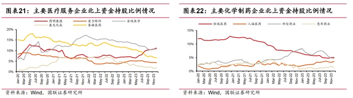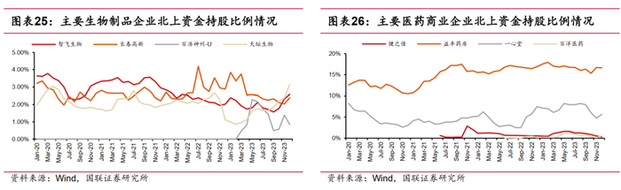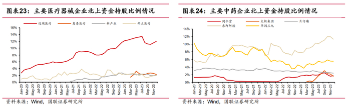 在公司维度, 2023年Q4北上资金净流入较多的公司依次为迈瑞医疗(28.4亿元)、 药明康德(16.8亿元)、 智飞生物(14.9亿元)、 联影医疗(8.1亿元)、 上海莱士(6.6亿元)、 天坛生物(6.5 亿元)。硬科技属性或者平台型公司较易获得北上资金青睐。净流出为云南白药(13.8亿元)、科伦药业(7.3亿元)、 爱美客(6.9亿元)、爱尔眼科(5.7亿元)、同仁堂(5.1亿元) 和国药一致(3.7 亿元)。