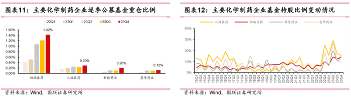 化学制药:2023Q4 化学制药基金重仓比例环比上升0.69pct 至3.18%,其中恒瑞医药1.42%(+0.21pct),人福医药0.29%(+0.06pct),科伦药业0.20%(+0.09pct)和恩华药业0.12%(+0.02pct)。随着合规政策走向常态化,对行业影响逐步出清,恒瑞医药等化学制药龙头持续获得加仓。