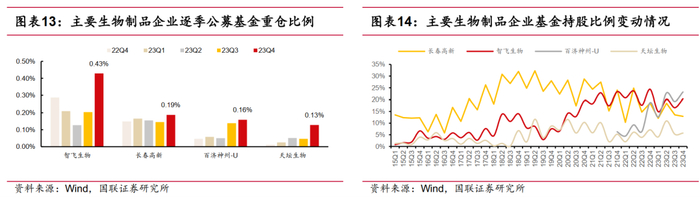 生物制品:2023Q4 生物制品基金重仓比例环比上升0.57pct 至 1.35%,其中智飞生物0.43%(+0.23pct),长春高新0.19%(+0.04pct),百济神州-J0.16%(+0.02pct)和天坛生物0.13%(+0.08pct)。智飞生物基金重仓比例环比提升主要为公司新增代理 GSK 带状疱疹疫苗,目前国内带状疱疹疫苗市场仍较为空白,未来随着老龄化程度不断加深,有望为公司带来一定业绩增量。
