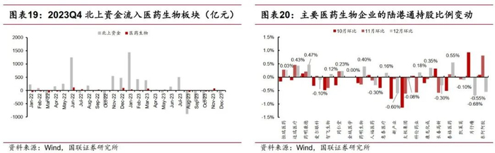 北上资金动向来看, 2023Q4北上资金净流入医药生物板块27亿元, 其中11月份净流入79亿元,10月及12月分别净流出 32 亿元和20亿元。
