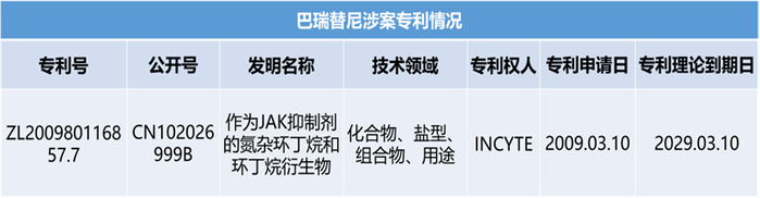 表1. 巴瑞替尼涉案专利情况,参考来源:中国专利检索平台