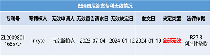 表3. 巴瑞替尼涉案专利无效情况,参考来源:国知局