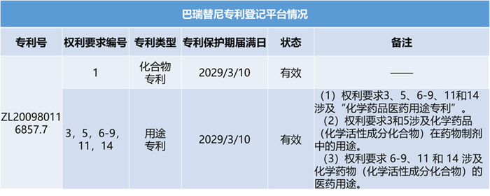 表2. 巴瑞替尼专利登记平台情况,参考来源:中国药品上市登记平台