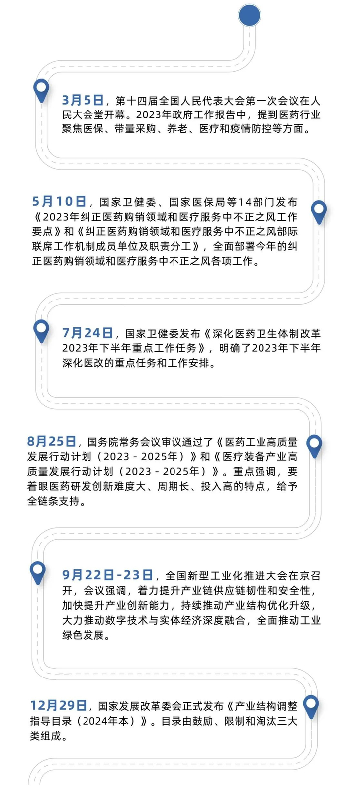 2023年医药行业政策致力于优化医药产业结构,提高医疗卫生服务质量,减低医疗保健成本,推动医药行业向高质量发展。2024年医药行业政策还将持续推进并创新,将继续围绕监管、降价、控费、高质量等持续发展。