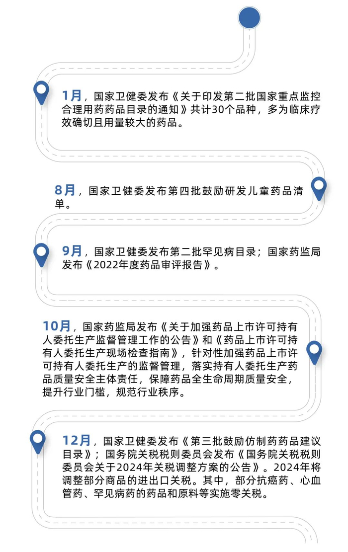 今年医药行业重点关注严格监管、研发创新、注重质量等。医药政策方面:发布多份药品清单,为临床试验、关键共性技术研究、优先审评审批等给予支持,加强对基础研究和医学创新的支持,鼓励企业加大研发投入,加快新药和医疗器械的研发步伐;医保政策方面:医保目录调整工作常态化推进,国家医保基金监管呈高压态势,从飞行检查、专项整治、日常监管、智能监控、社会监督五个维度出发,以点、线、面相结合的方式推进基金监管常态化;医疗政策方面:合理用药、公立医药改革、分级诊疗等方面均有重要政策发布。