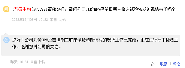2023年12月14日,万泰生物在回复投资者提问时表示,公司九价HPV疫苗Ⅲ期主临床试验V8期访视的现场工作已完成,正在进行标本检测工作。
