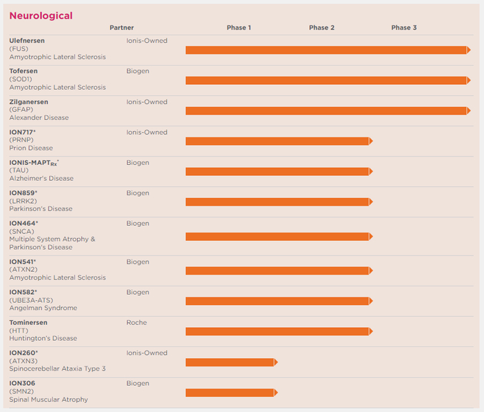 Ionis pharmaceuticals成立于1989年,总部位于美国加州卡尔斯巴德,是一家发现和开发RNA靶向疗法的公司。拥有治疗复杂和罕见疾病的反义技术平台。Ionis拥有两大技术平台——核苷酸化学修饰技术平台,以及GalNAc LICA递送技术平台,两大技术的融合大大提高了Ionis新药开发效能。依靠强大的平台,公司通过授权转让的方式,与包括Roche、Biogen、AstraZeneca、GSK、Johnson & Johnson、BMS等知名公司达成合作。