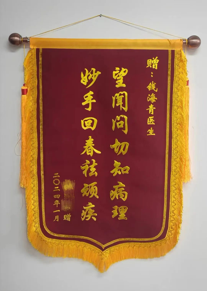 在钱海青医生的调理下,胡先生疾病的各项指标在后期的复查中,均有所好转并趋于稳定状态,对此胡先生心情非常激动和高兴。为感谢医生医术的高明,胡先生特意定制了锦旗送给钱海青医生。