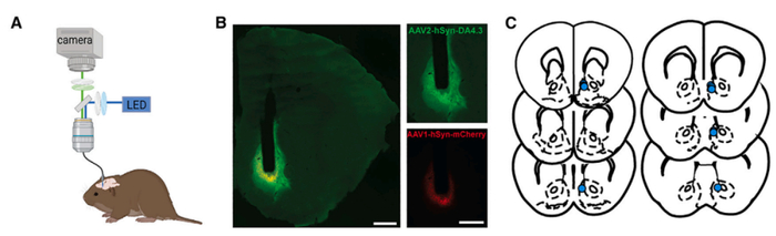 与此同时,一个微小的光纤传感器以毫秒为单位实时跟踪草原田鼠大脑伏隔核(Nucleus Accumben)的神经活动,光纤传感器可以检测大脑多巴胺的释放并发光。伏隔核位于大脑基底核与边缘系统交界处,被认为是大脑的快乐中枢,对食物、烟酒等成瘾物质和性等快感刺激产生反应。