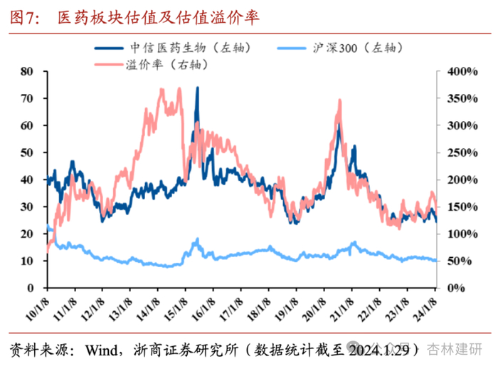 估值有所下降。截至2024年1月29日,医药板块整体估值(TTM,剔除负值)为24.65倍,较2023年12月29日估值减少3.4;医药行业相对沪深300的估值溢价率为136%,较2023年12月29日减少32pct,明显低于四年来中枢水平(162.57%)。截至2024年1月29日,估值绝对值排名前3的板块为中药饮片、医疗器械、医疗服务,市盈率分别为31倍、29倍、27倍。