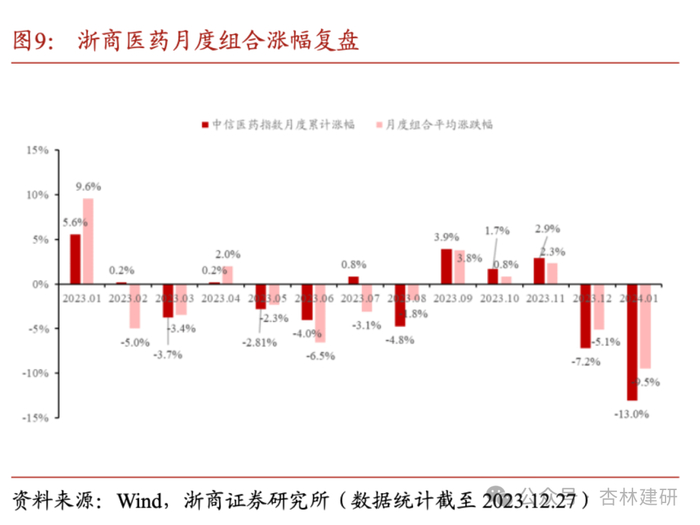 截至2024年1月29日,2024年1月个股涨幅前三分别为开开实业(+14.2%)、华润三九(+14.2%)、英诺特(+13.9%);个股跌幅前三分别为荣昌生物(-32.5%)、药康生物(-31.1%)及鹿得医疗(-29.3%)。