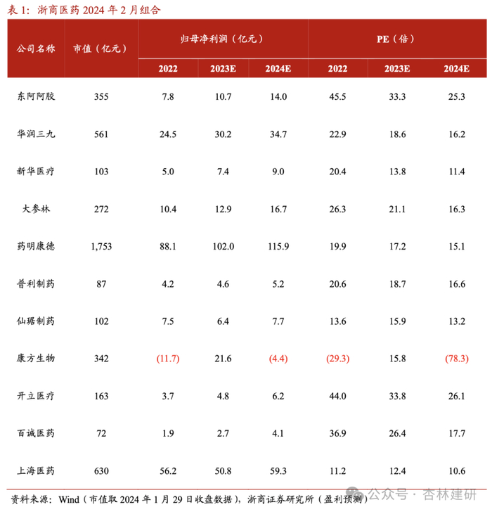 浙商医药2024年2月组合:东阿阿胶、华润三九、新华医疗、大参林、药明康德、普利制药、仙琚制药、康方生物、开立医疗、百诚医药、上海医药。