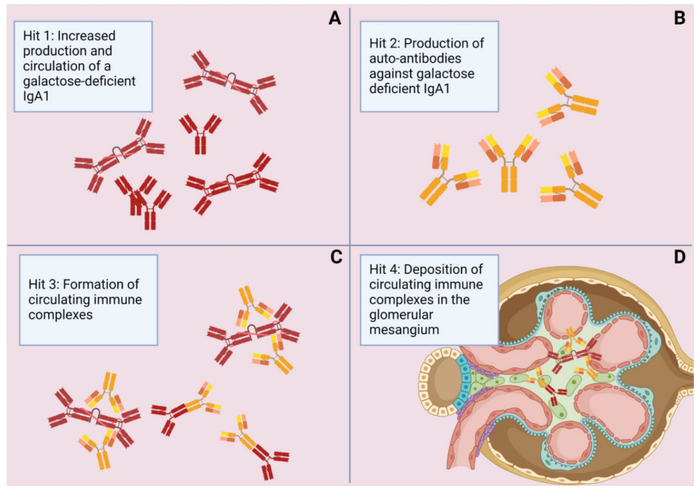 IgA肾病的发病机制还未完全明确,目前被广泛接受的理论认为,IgA肾病是多种机制共同导致的,而非单一机制,被称为“多重打击假说”。