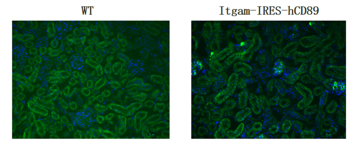 IgA deposition can be detected in the glomerulus and mesangial area of the renal tubules in the Itgam-IRES-hCD89 mice, but no deposition was found in the wild-type mice. (Data provided by partners)
